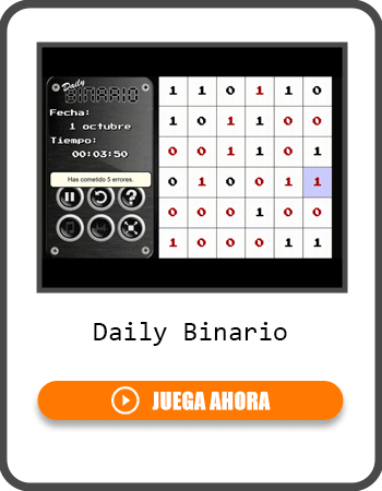 Daily Binario es un rompecabezas de lógica en el que debes llenar una cuadrícula solo con ceros y unos siguiendo reglas específicas. No puede haber más de dos números iguales seguidos en una fila o columna, y cada línea debe ser única. Cada día aparece un nuevo desafío que pondrá a prueba tu capacidad de deducción y tu paciencia. Un juego perfecto para los amantes de los sudokus y los puzzles numéricos. 🔢🧩 ¿Podrás resolver el reto binario de hoy?
